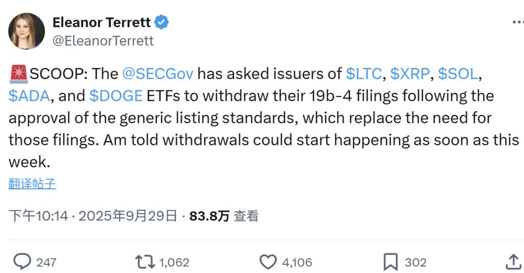 据加密记者 Eleanor Terrett 披露,美 SEC 已要求 LTC、XRP、SOL、ADA 和 DOGE ETF 的发行方撤回其 19b-4 文件,因为在通用上市标准获批后,这些文件已不再需要。
