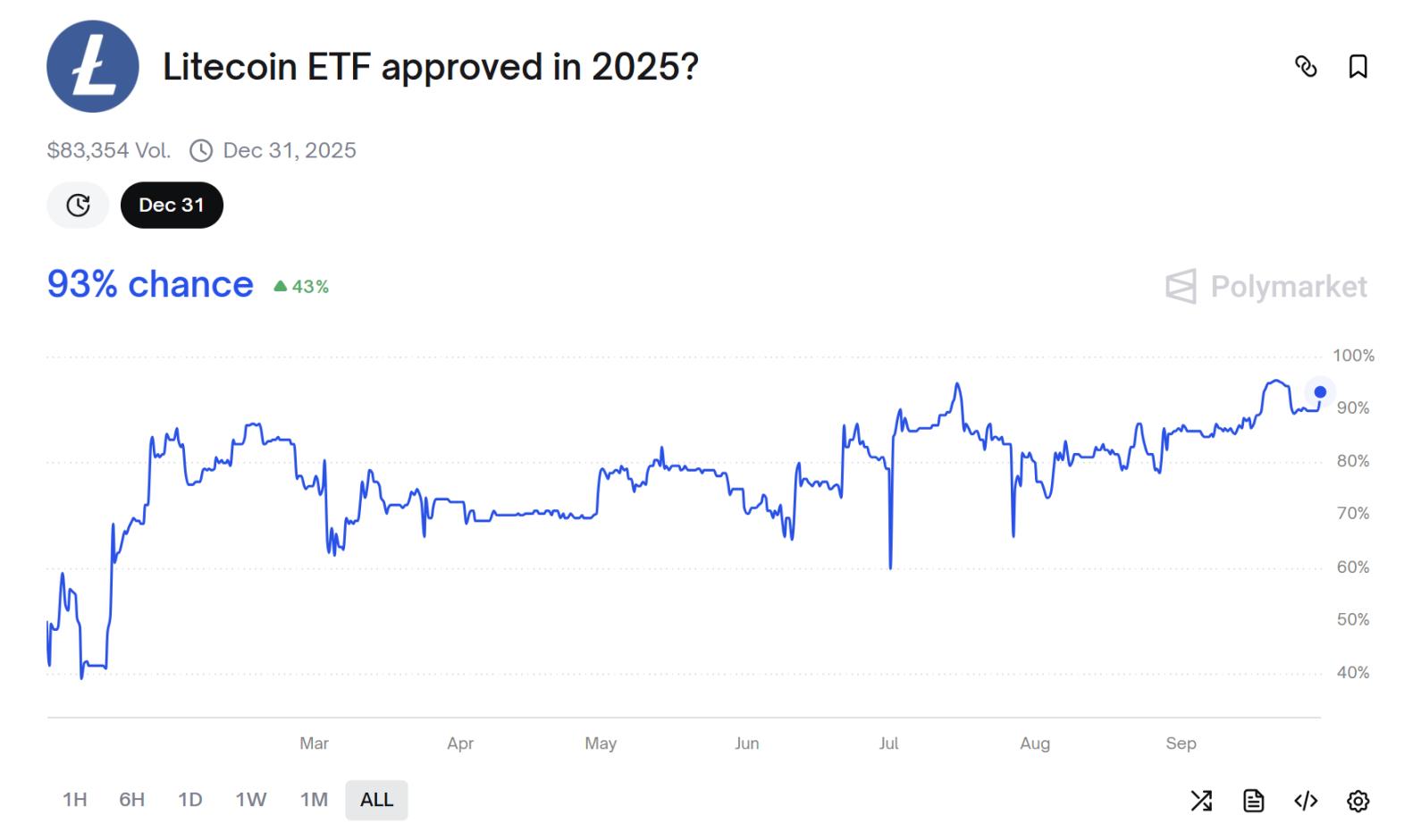 截止目前,Polymarket 上市场押注莱特币现货 ETF 今年获批的概率升至 93%。