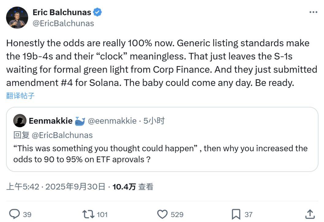 针对 SOL 的现货 ETF 情况,彭博 ETF 分析师 Eric Balchunas 表示,「说实话,SOL 现货 ETF 获批的成功率现在接近 100%。通用的上市标准让 19b-4 文件及其时间节点变得毫无意义,现在就只剩下 S-1 表格相关事宜了。孩子随时都可能出生,做好准备吧。」