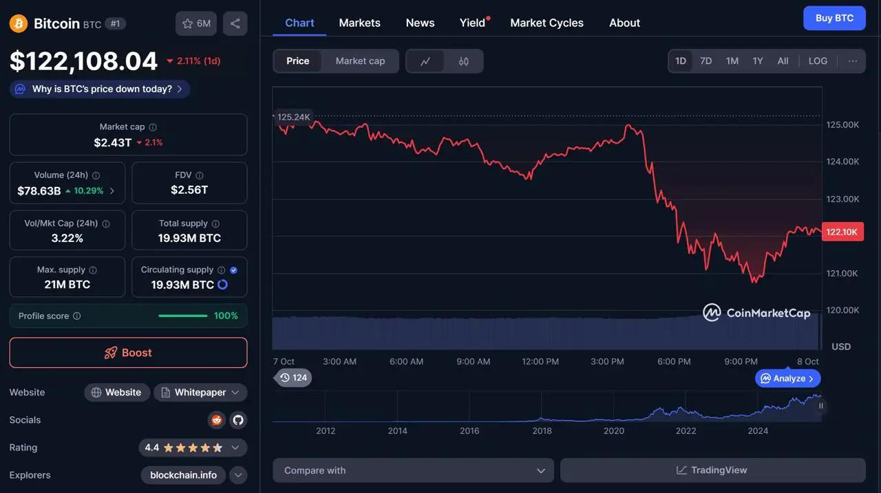 " >市值靠近2.43万亿美元,FDV关于2.56万亿美元,24小时成交量约720.2亿美元,流通供应量接近1992万比特币。它仍然奠定了基准资产的基调。稳定的机构需求、ETF 以及 BTC 作为长期价值存储手段的日益普及推动了这一上涨。如果看涨情绪持续,目标价位在13万美元和15万美元留在桌子上。